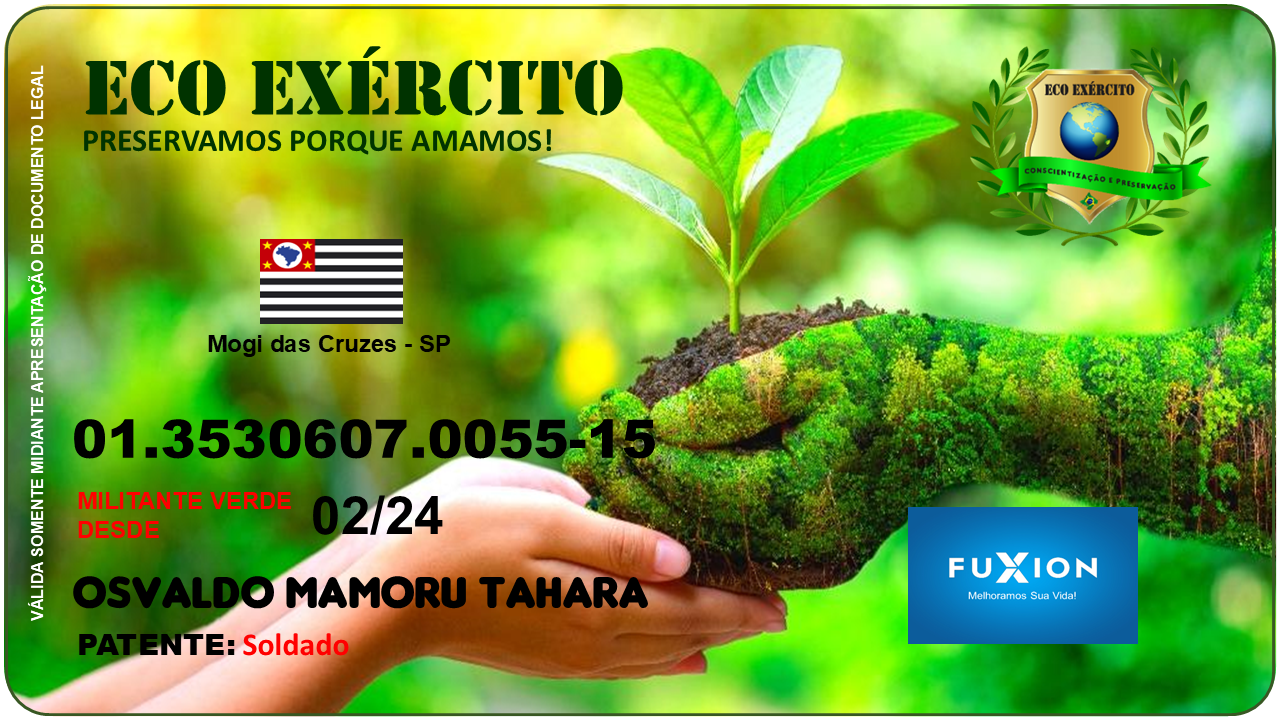 As empresas apoiadoras que nos ajudarem com a doação mensal de R$ 50,00 (cinquenta reais) terão direito à inserção de sua marca no ECO GUIA pelo período de 12 (doze) meses renovados automaticamente após este período. Receberão via WhatsApp em PDF um Certificado de EMPRESA AMIGA DA NATUREZA, seu responsável receberá uma Credencial pessoal do ECO EXÉRCITO e mais o direito de fazer a indicação gratuita de 10 (dez) credenciais digitais (pessoas físicas) que serão emitidas com a logomarca de seu estabelecimento comercial ou prestador de serviços.