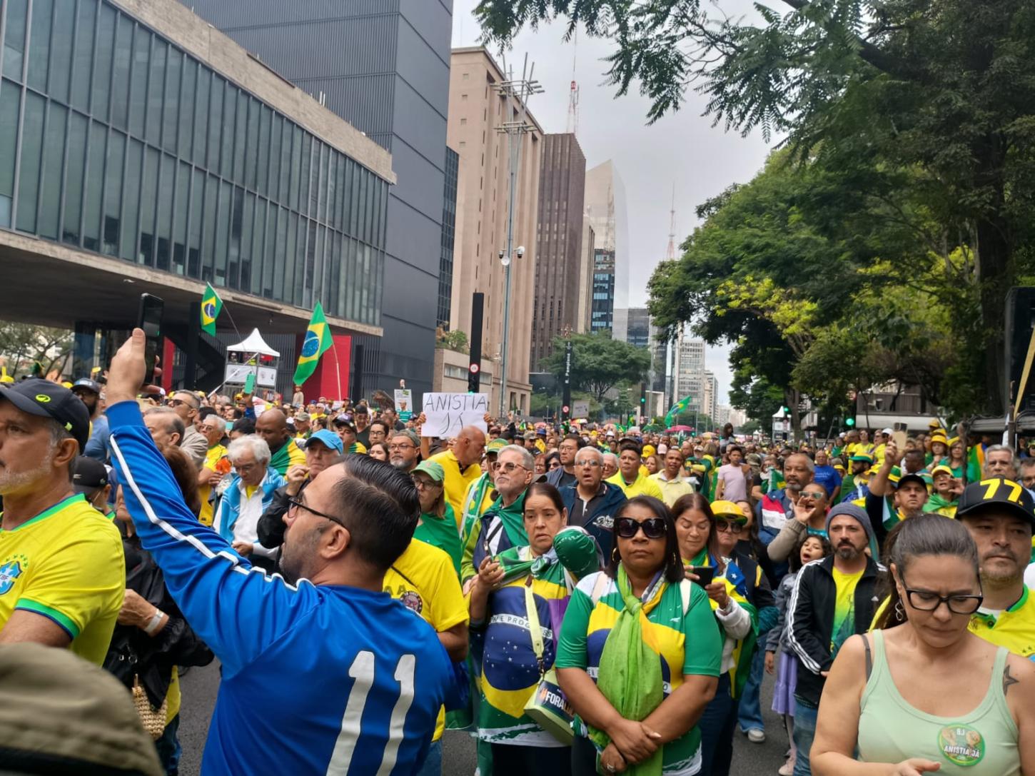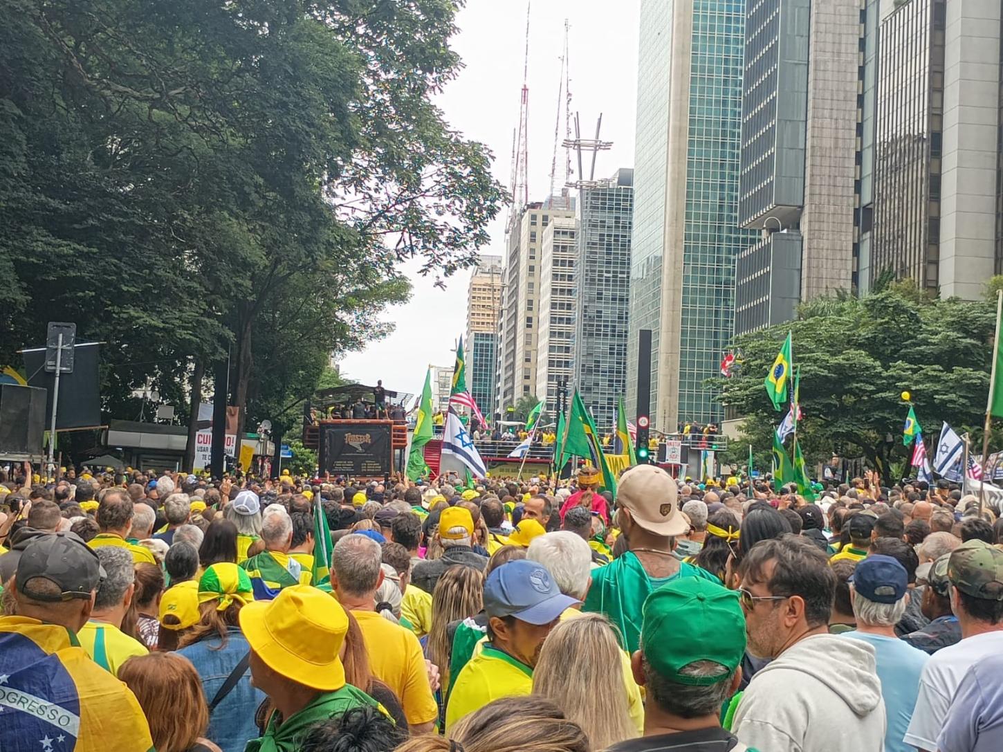 Bolsonaro e a ex-primeira-dama Michelle subiram no caminhão de som, estacionado próximo ao Masp, e acenaram para a multidão antes do início do ato, que foi organizado pelo pastor Silas Malafaia, e teve início às 14h