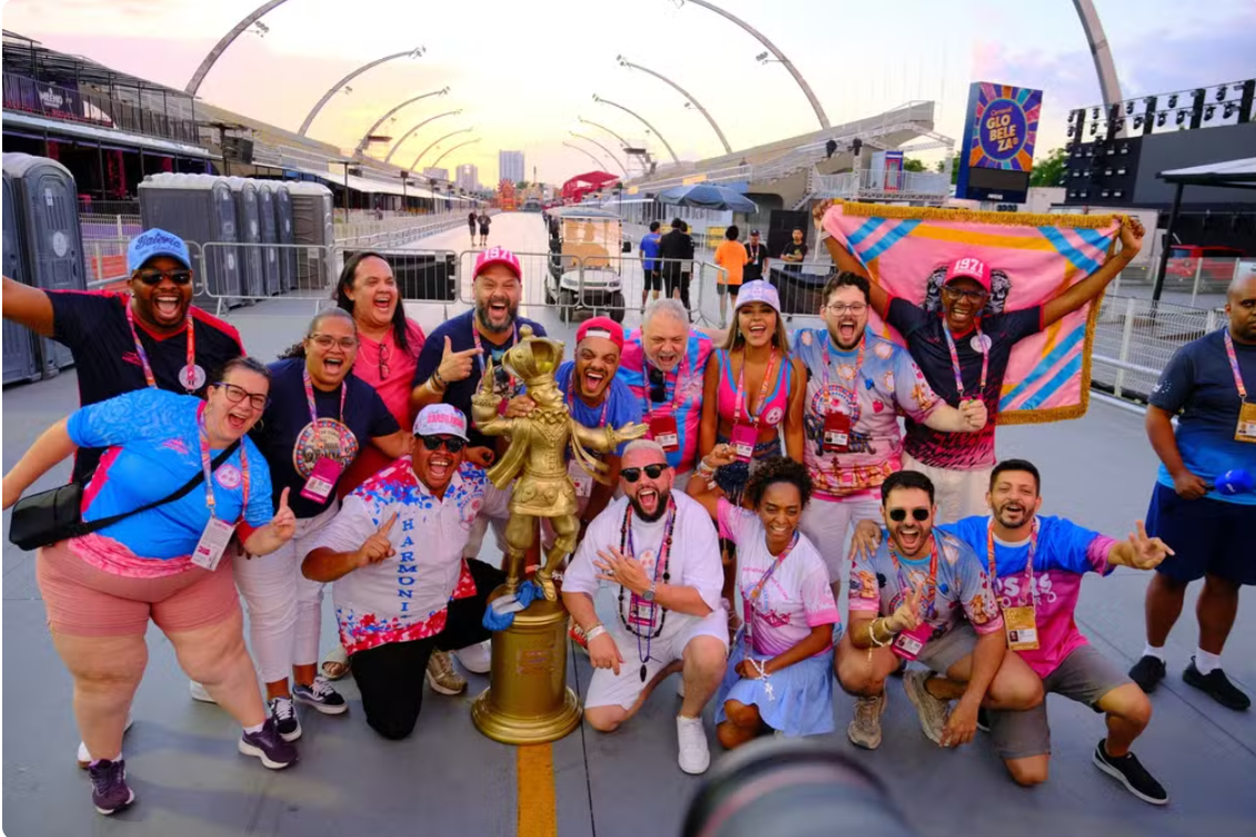 Integrantes da Rosas de Ouro exibem o troféu de campeões do carnaval de 2025, oitavo título da escola da Brasilândia, na Zona Norte. — Foto: Luiz Franco/g1